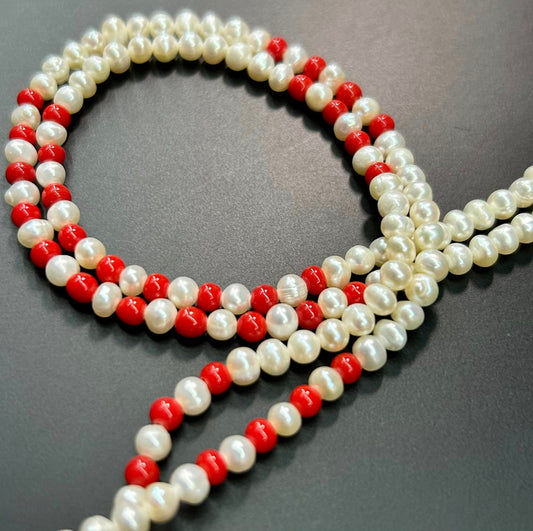 Double Strand Pearl & Red Bead Necklace