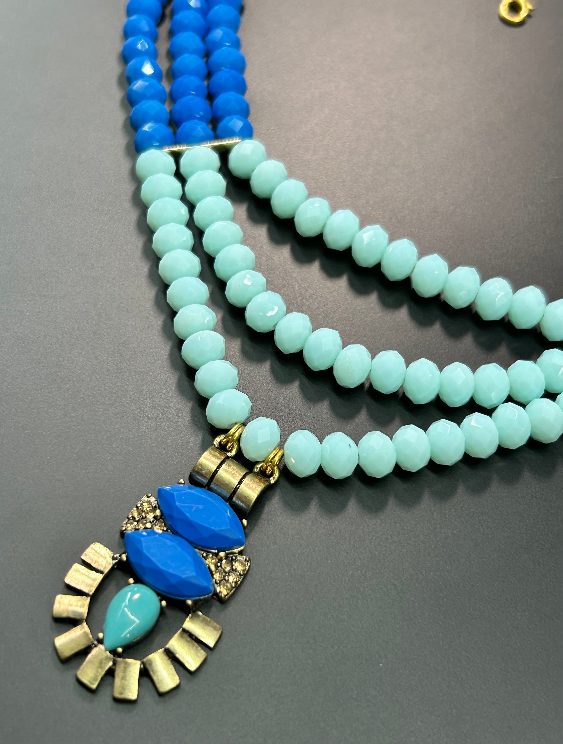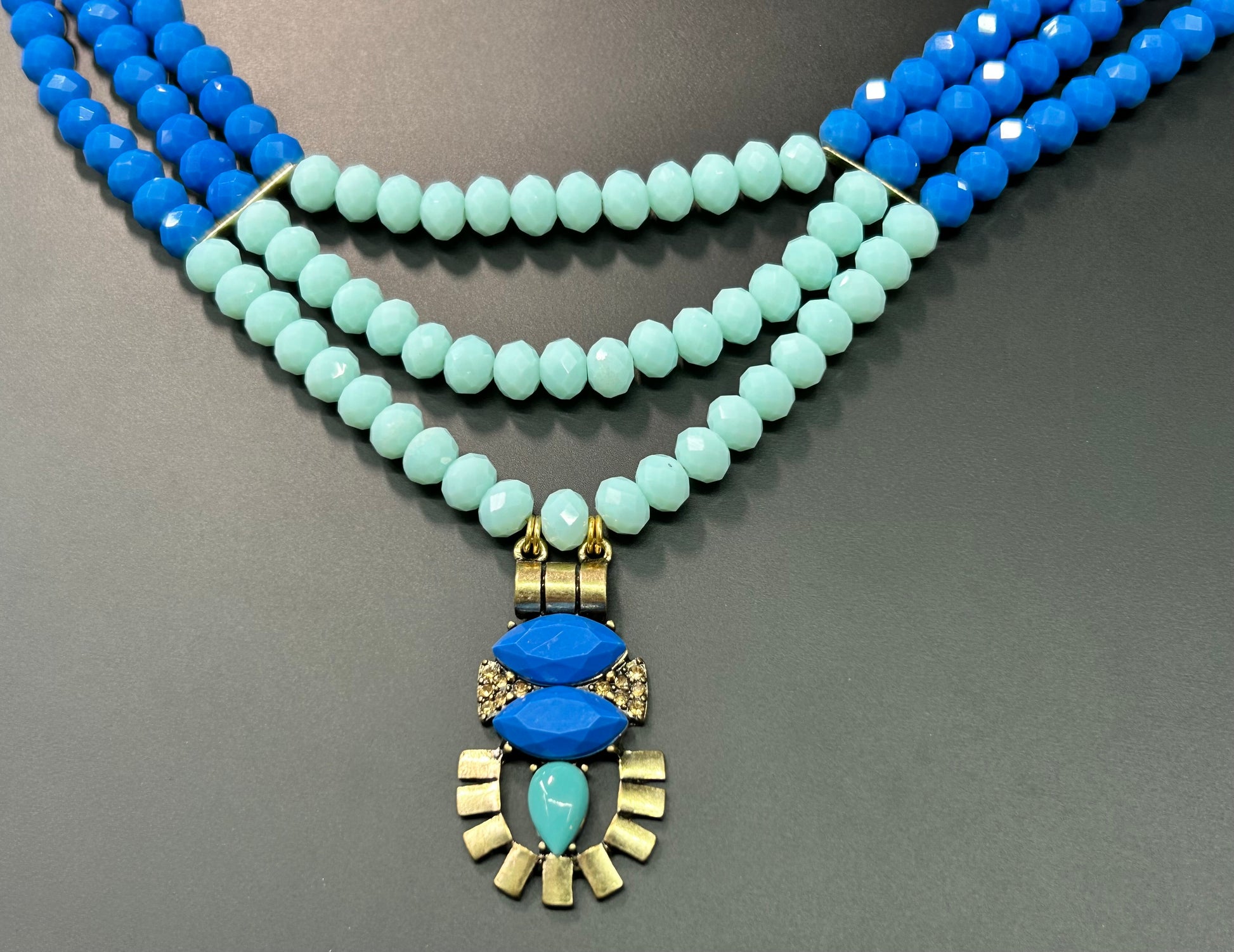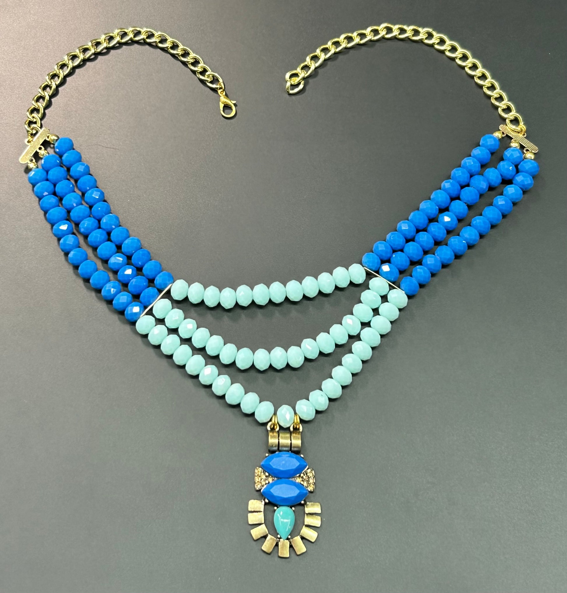 3 strand blue faceted glass necklace with acrylic rhinestone pendant and gold tone accents