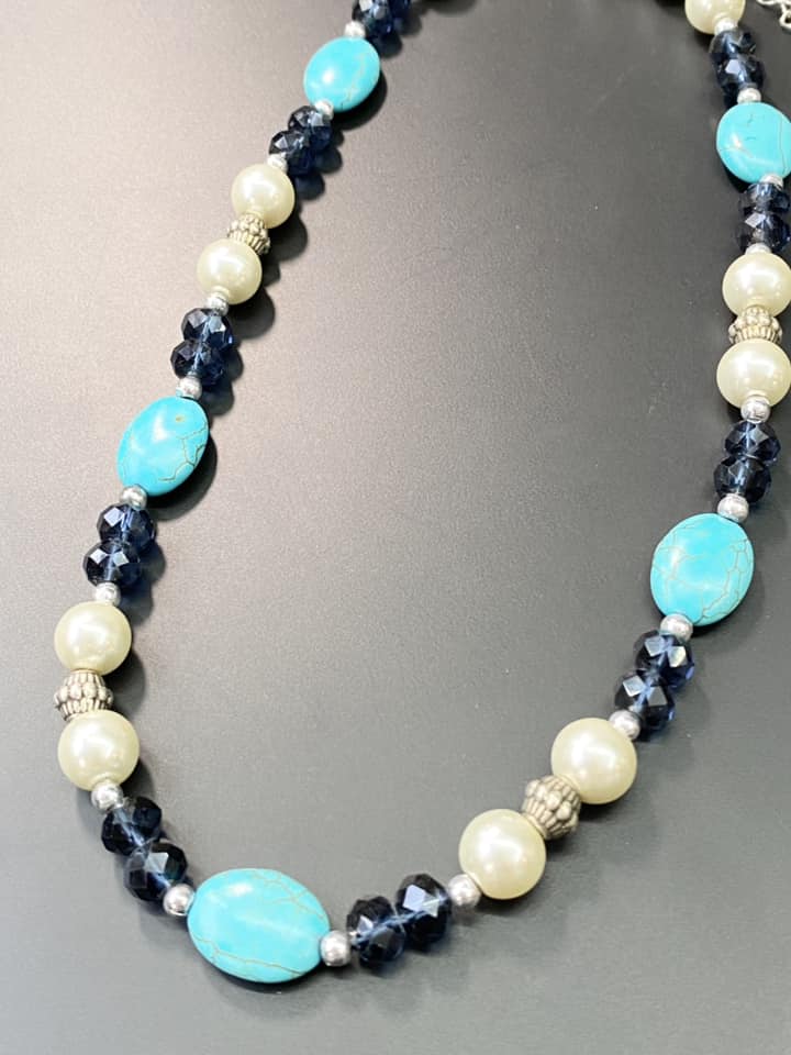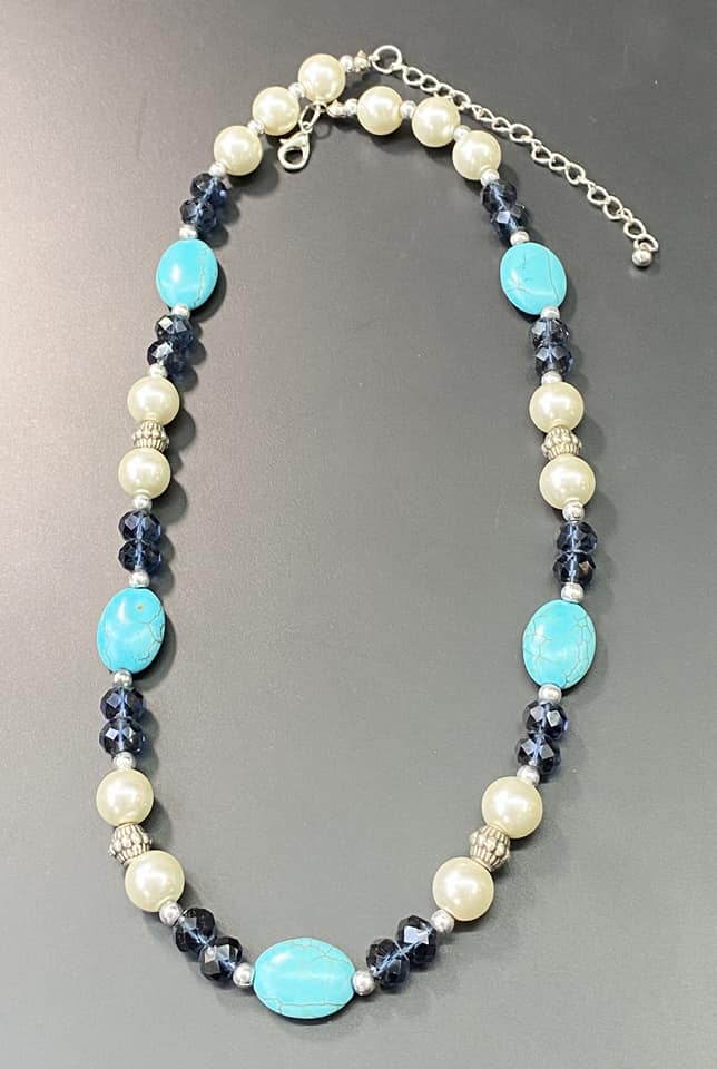 Silver tone dyed stone, faceted glass, and faux pearl bead necklace
