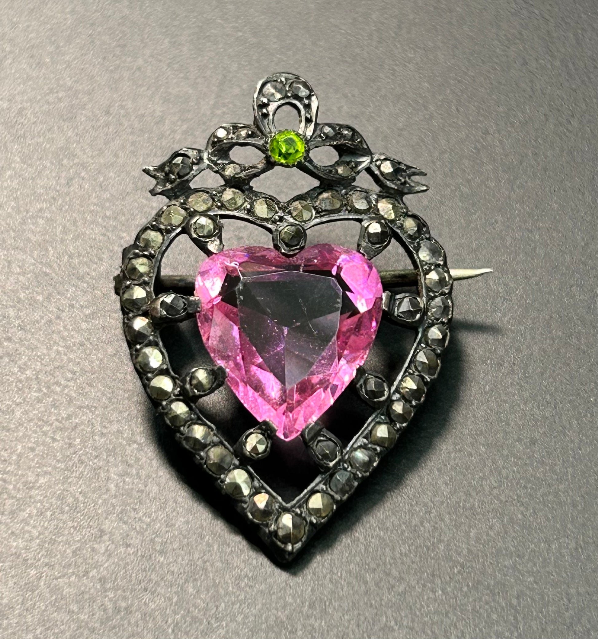 Victorian sterling silver marcasite and glass heart brooch