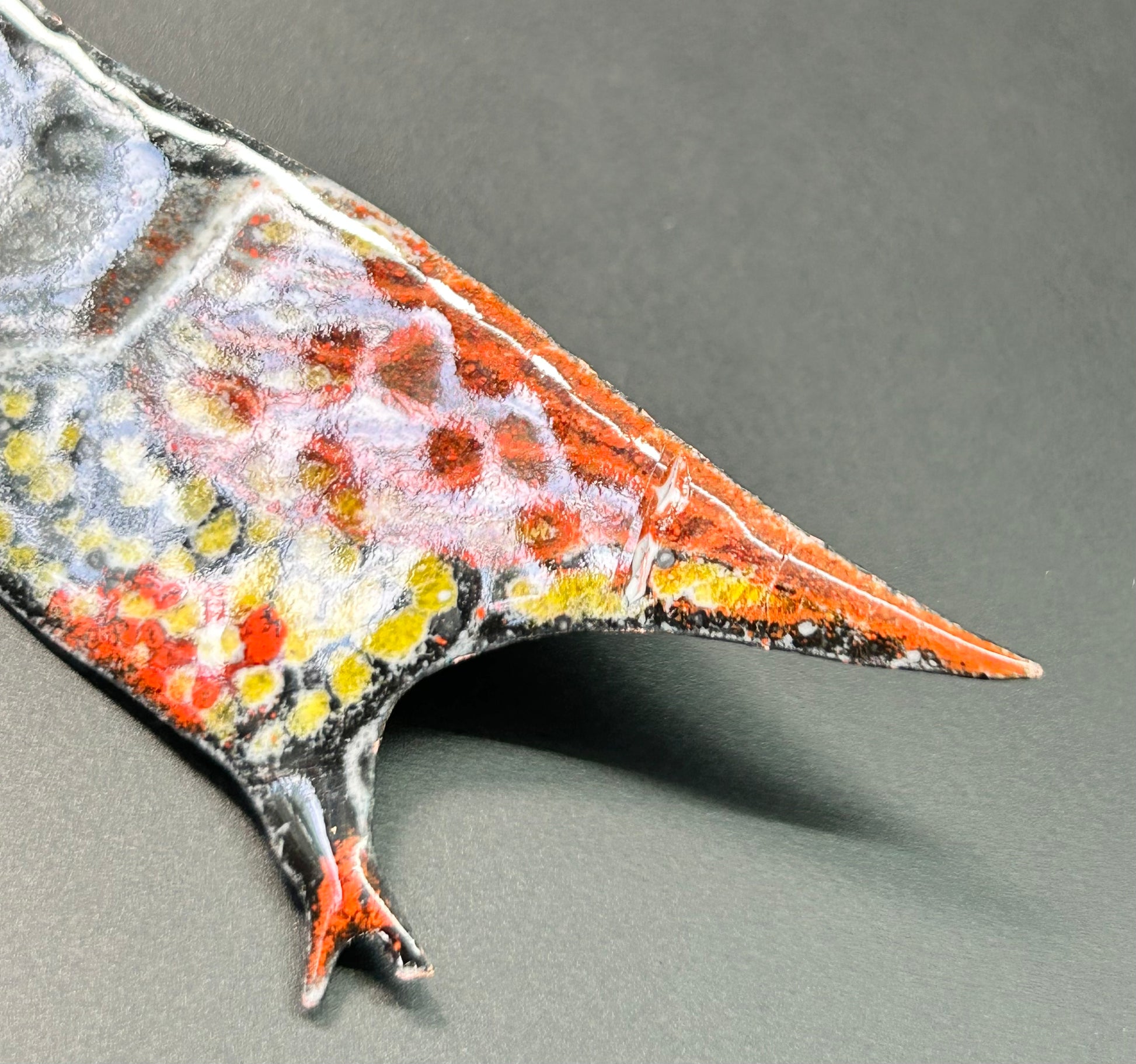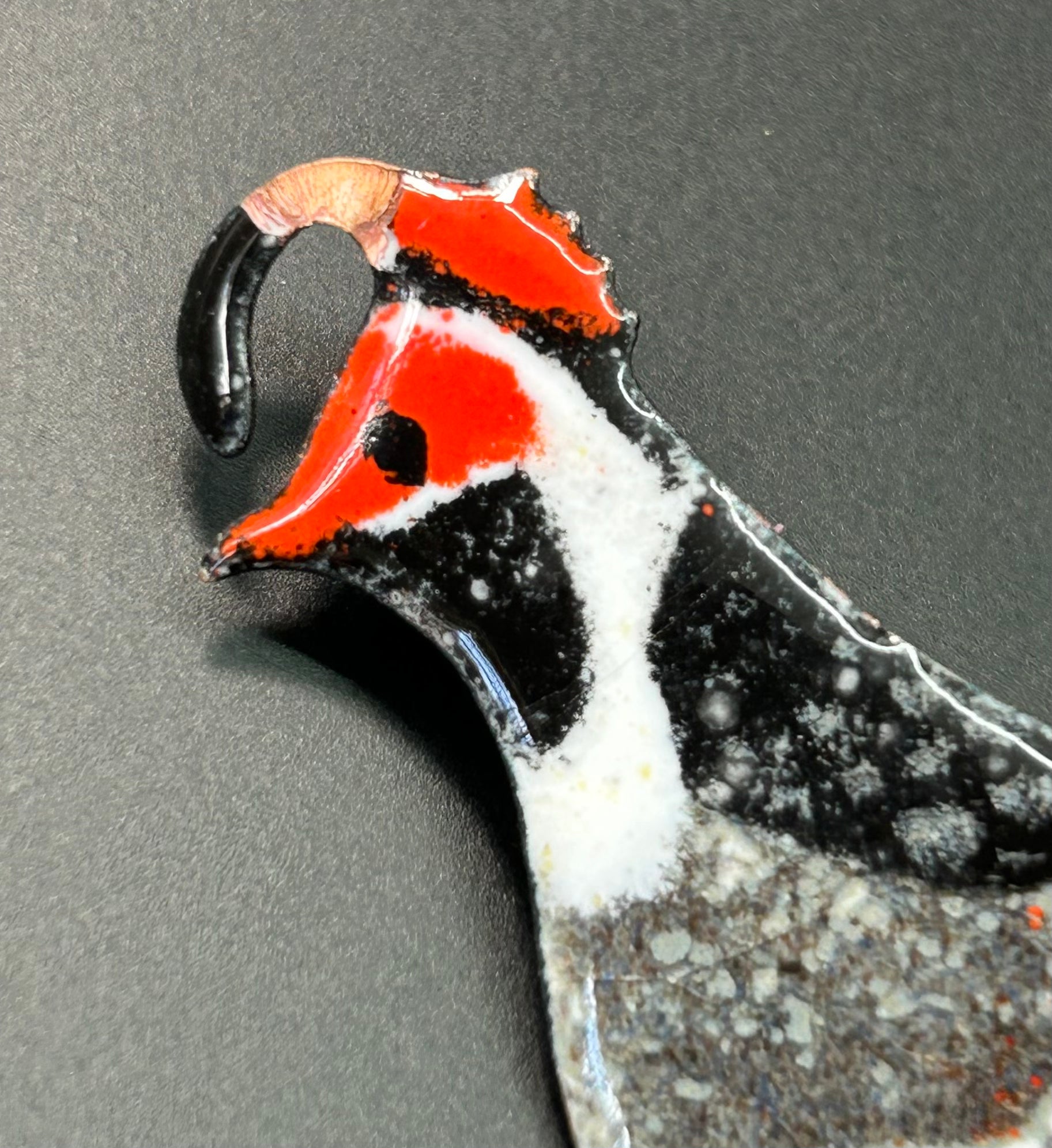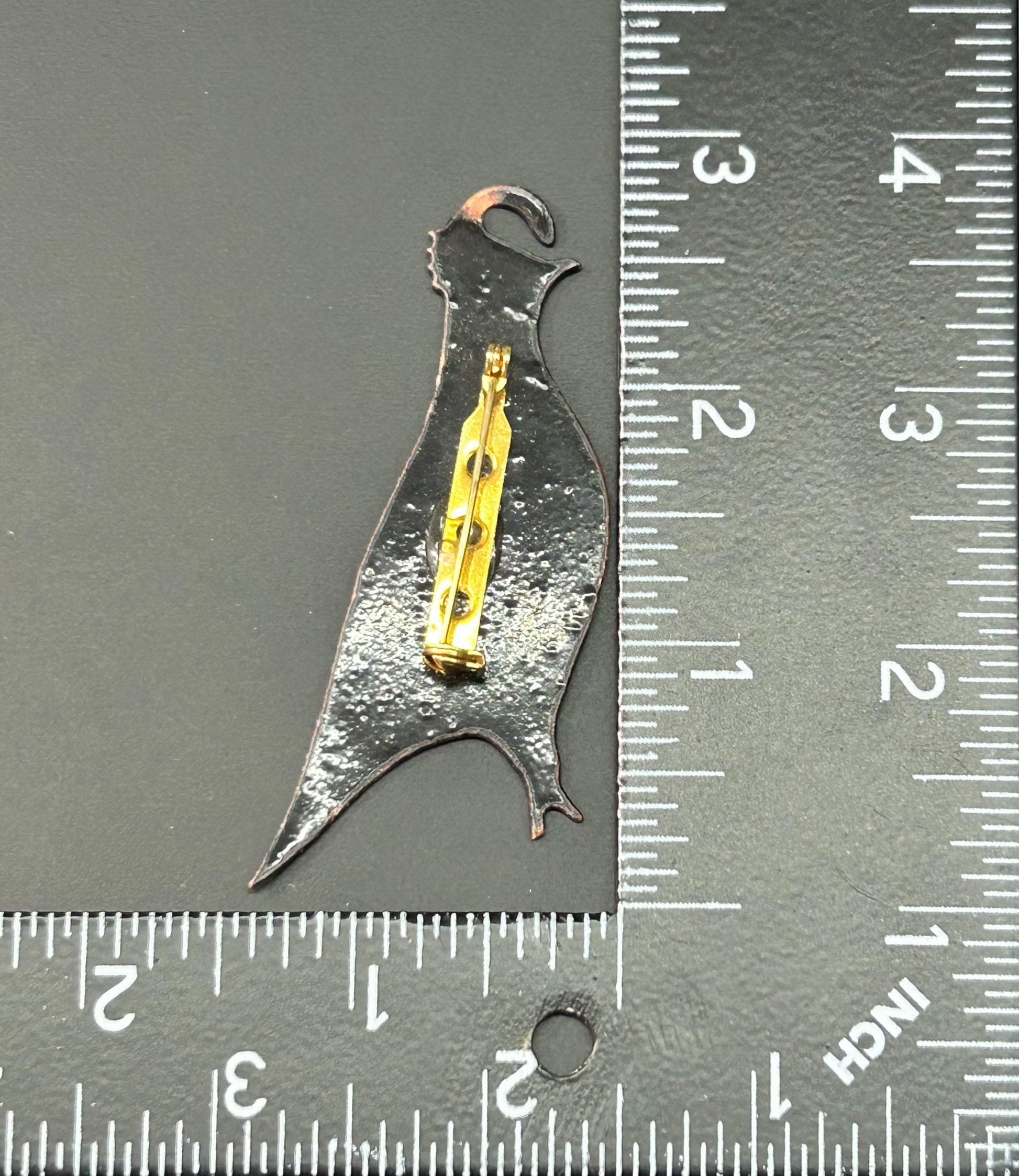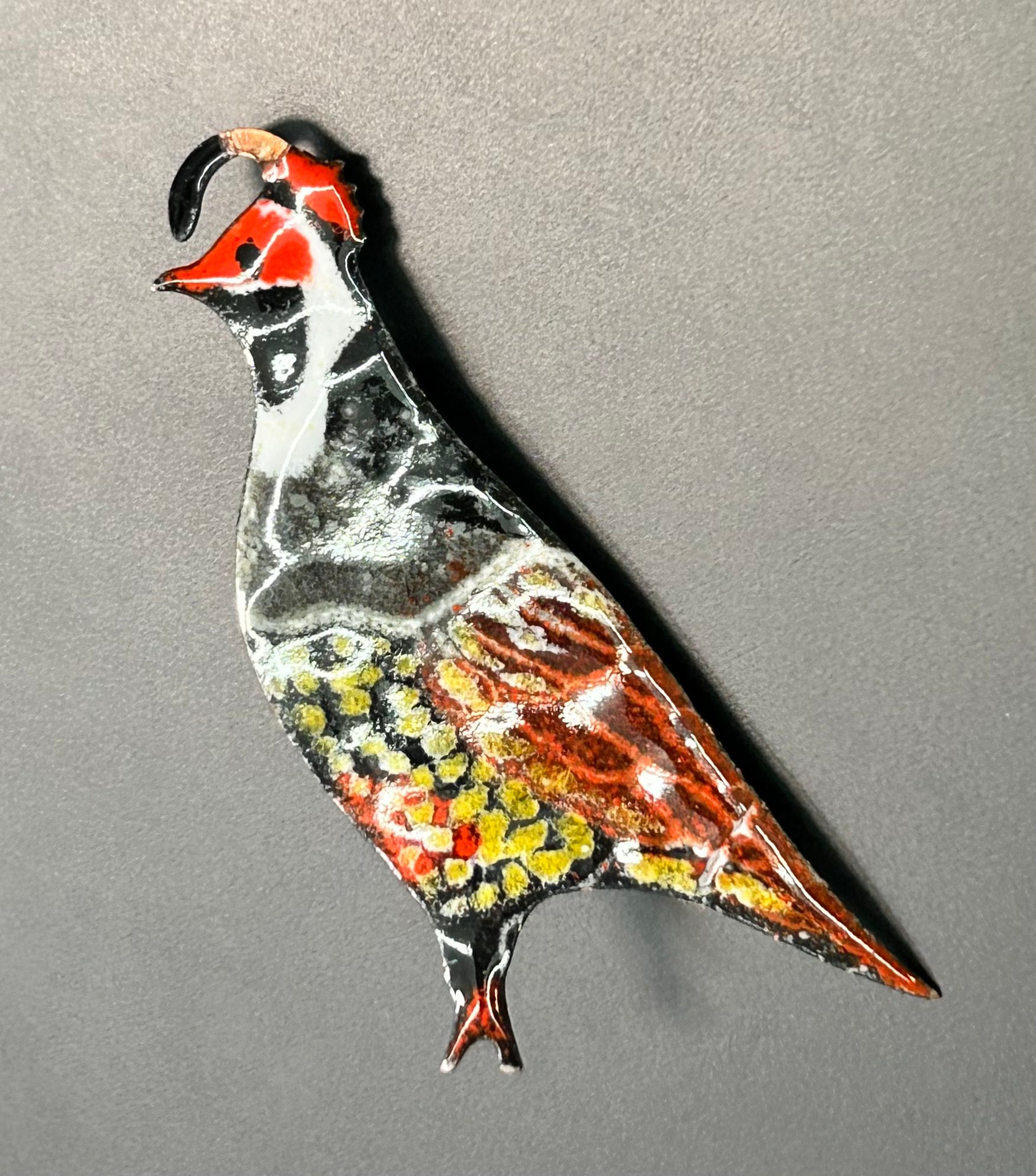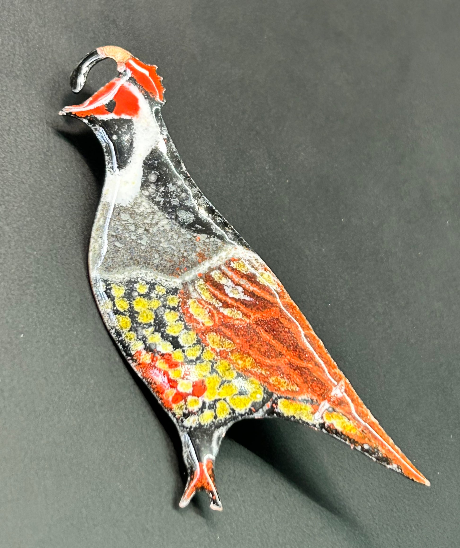 Enamel over copper quail brooch