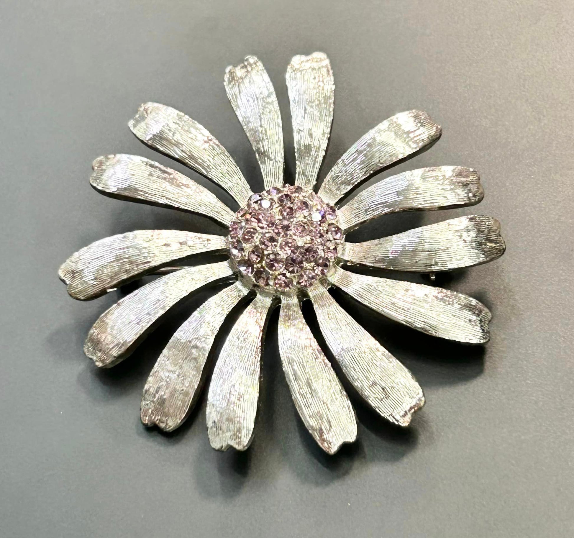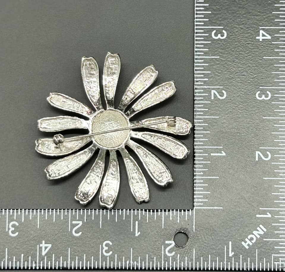 Silver tone pink rhinestone flower brooch