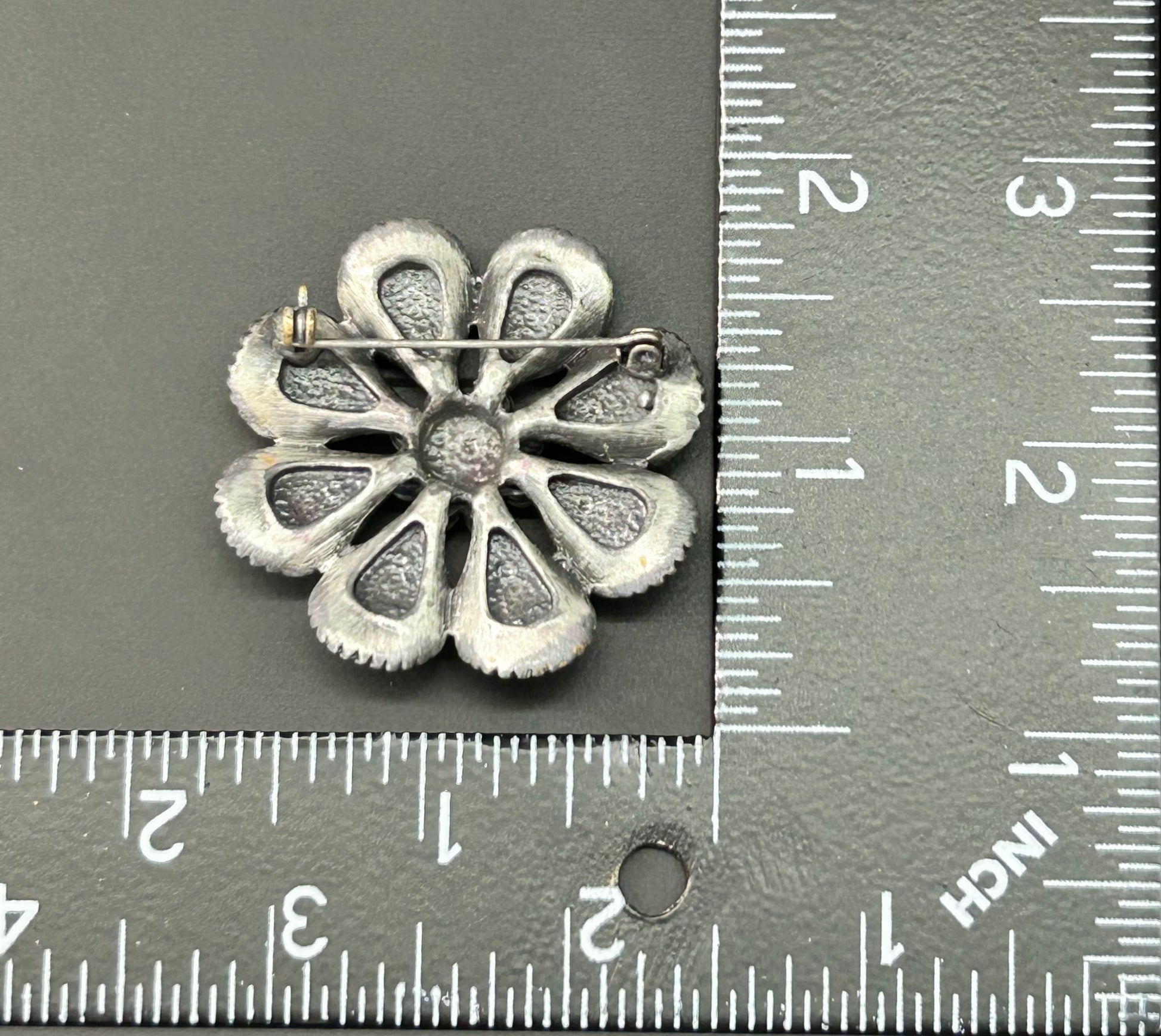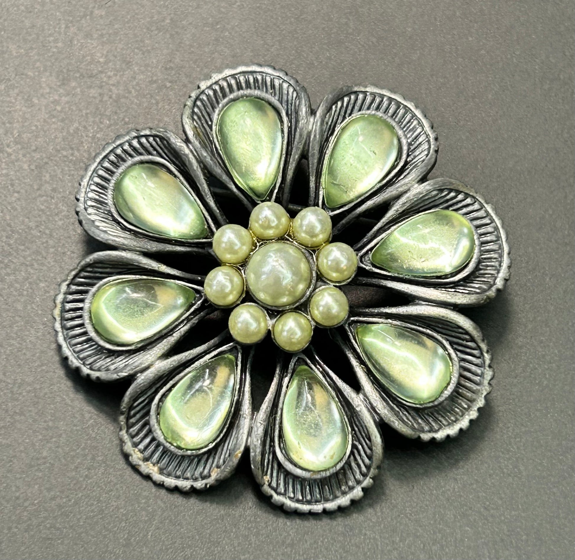 Silver tone green flower brooch