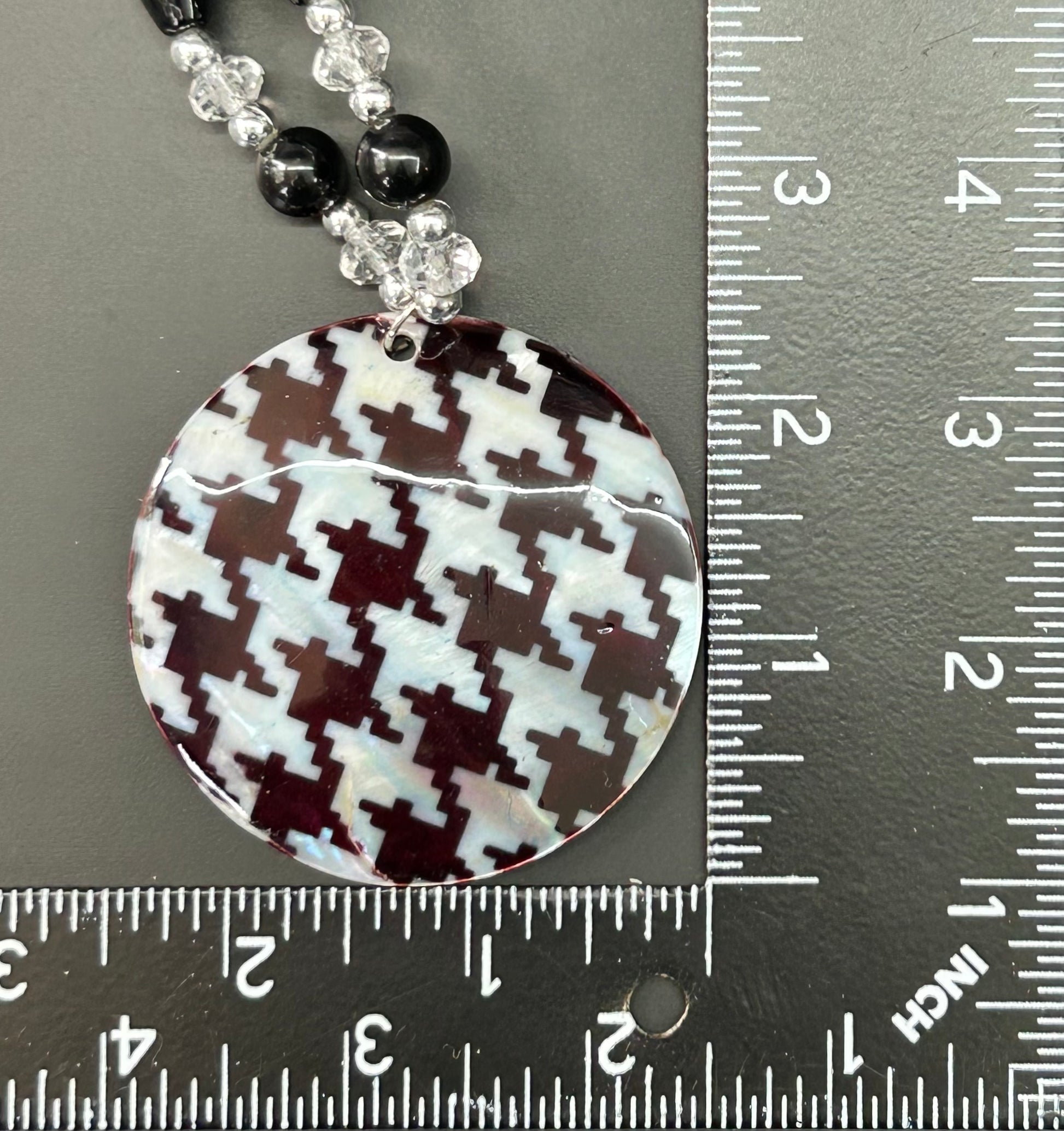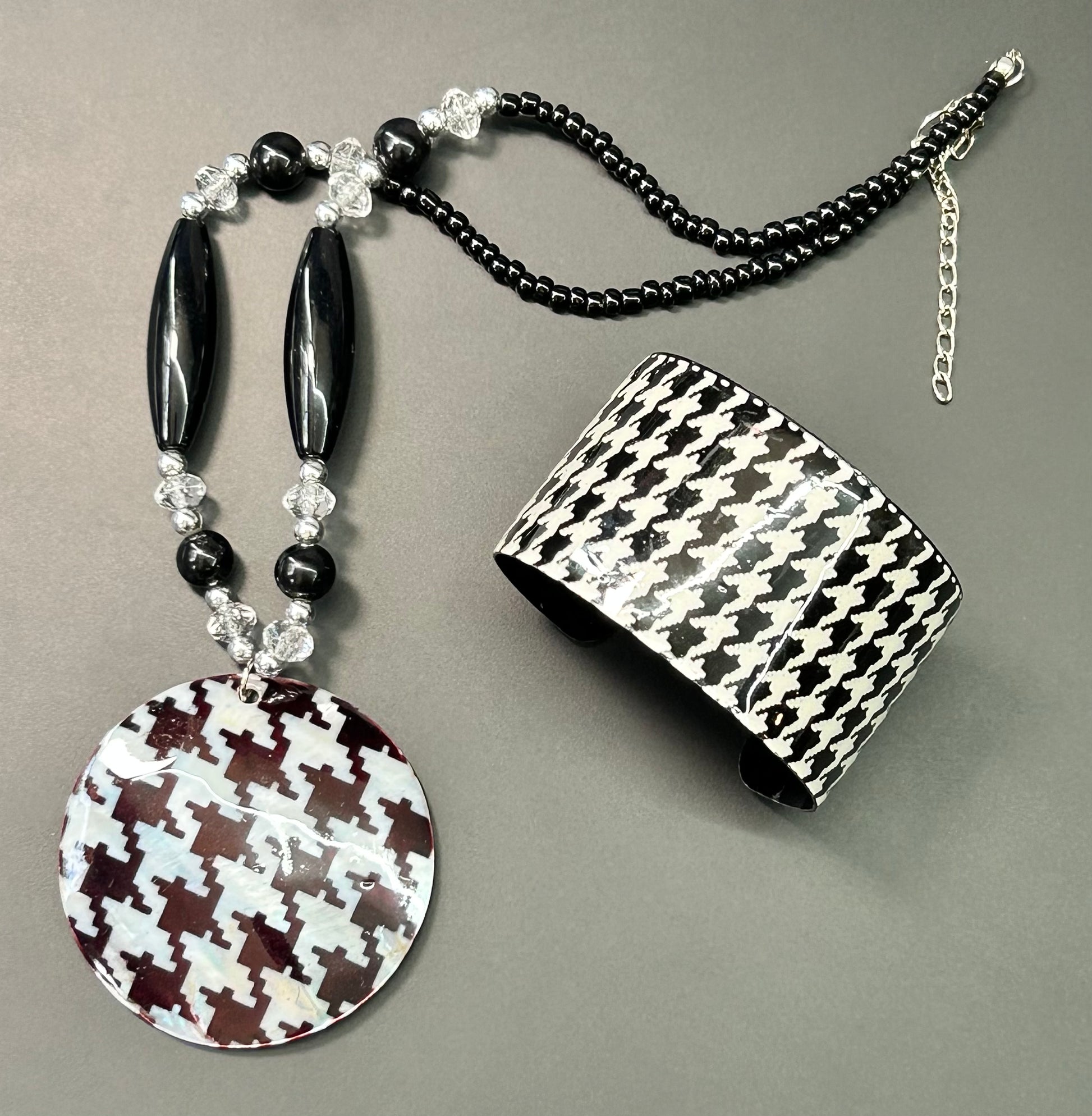 Houndstooth painted shell pendant acrylic bead necklace and base metal cuff bracelet