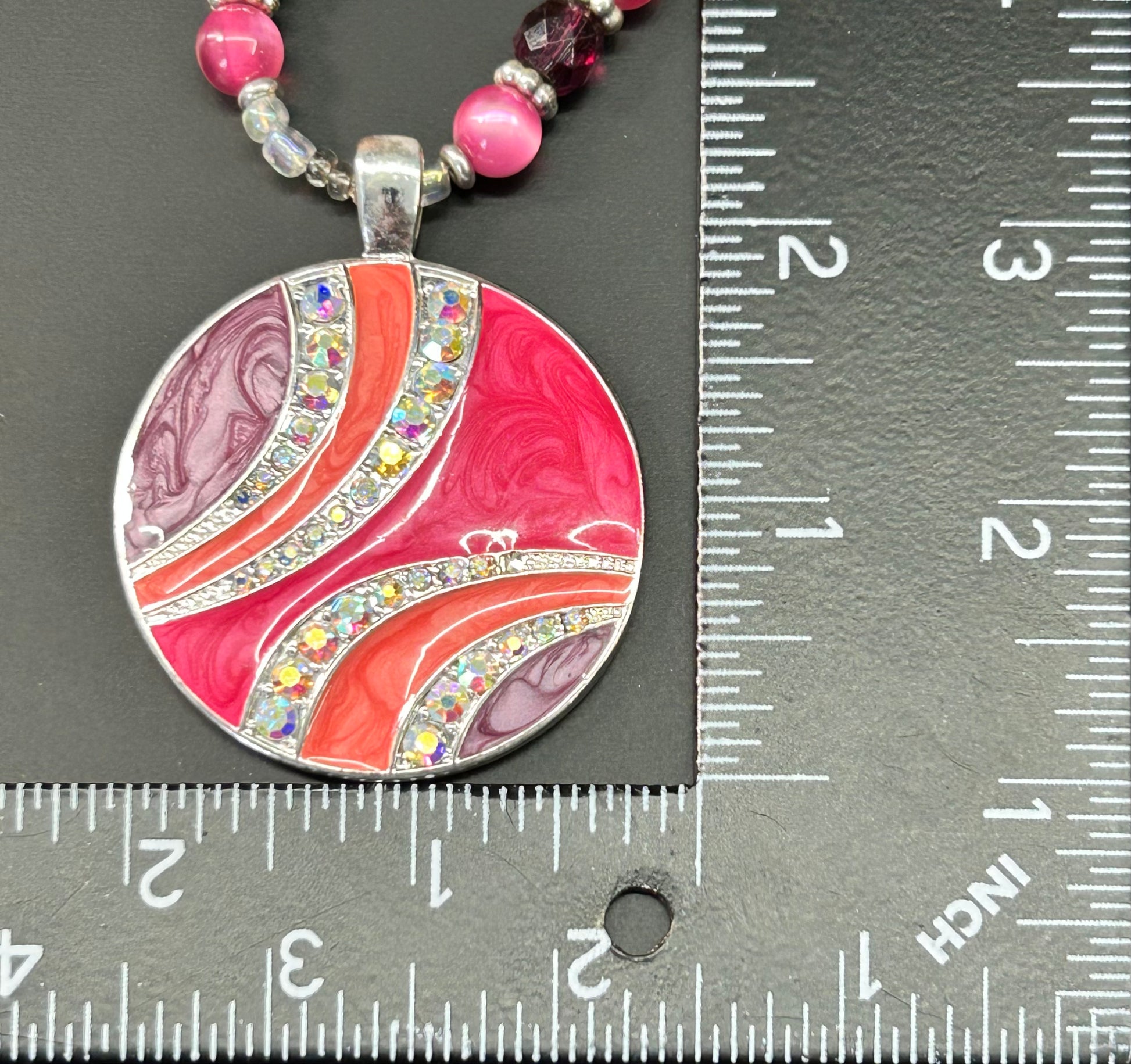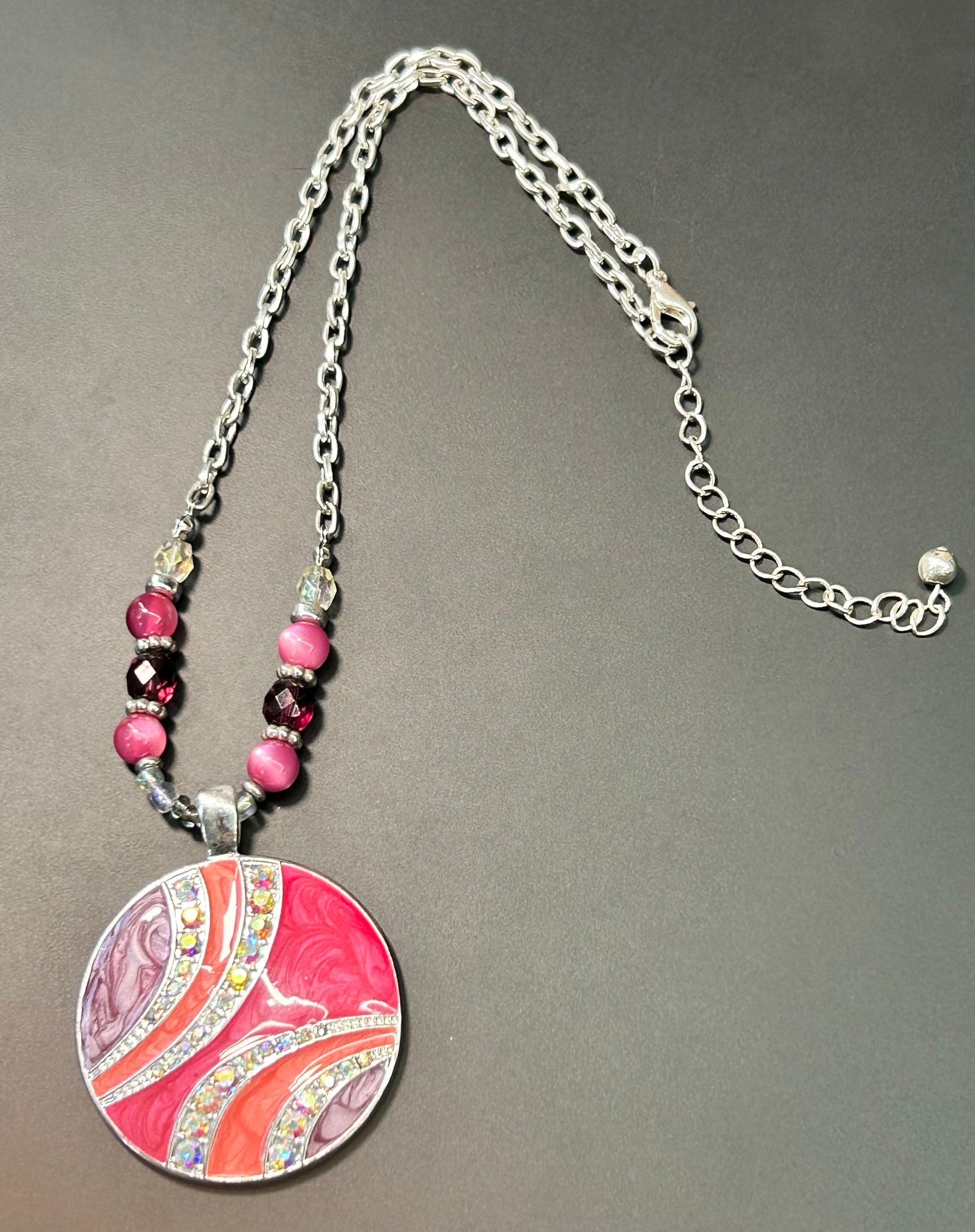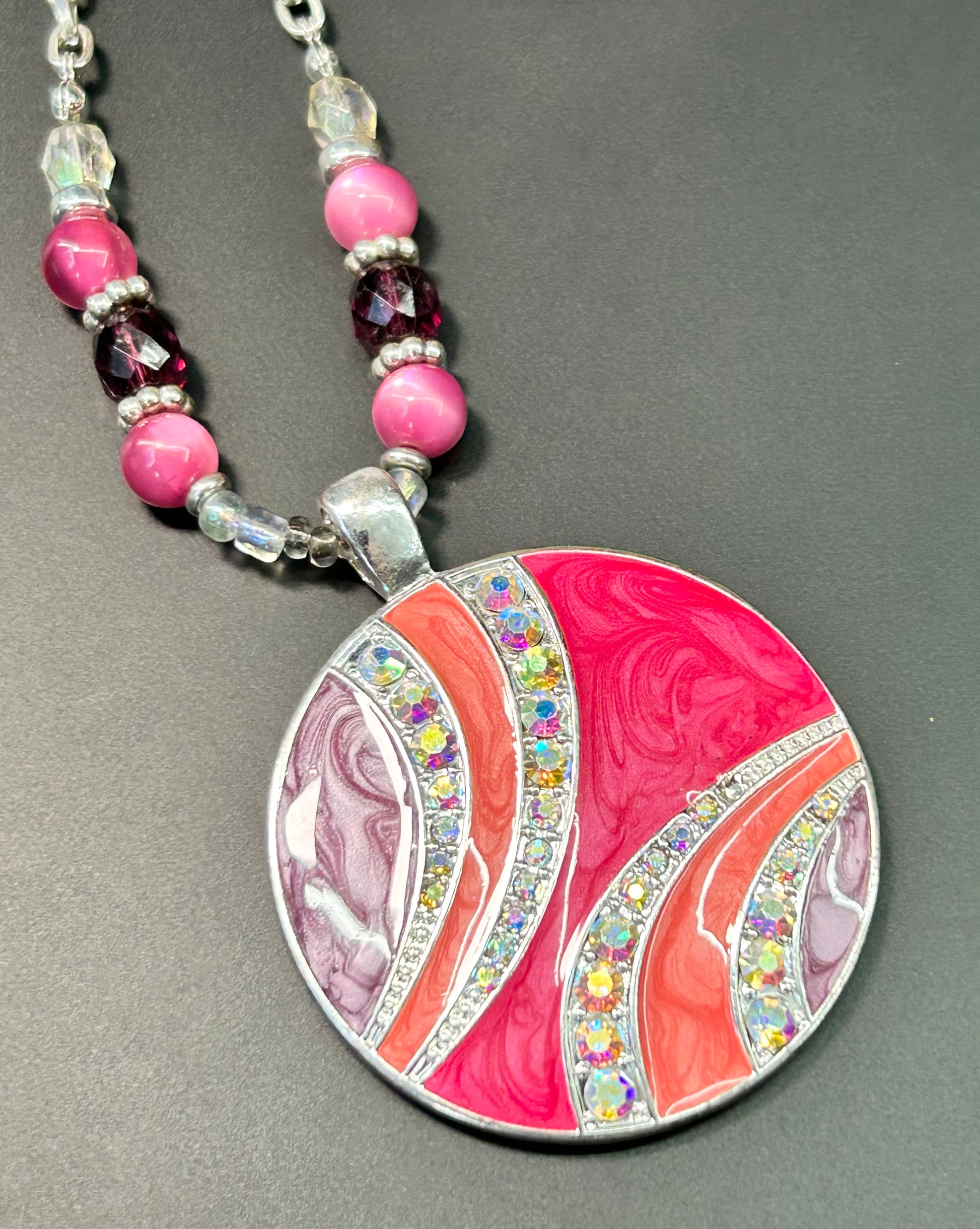 Silver tone enamel and rhinestone pendant beaded necklace