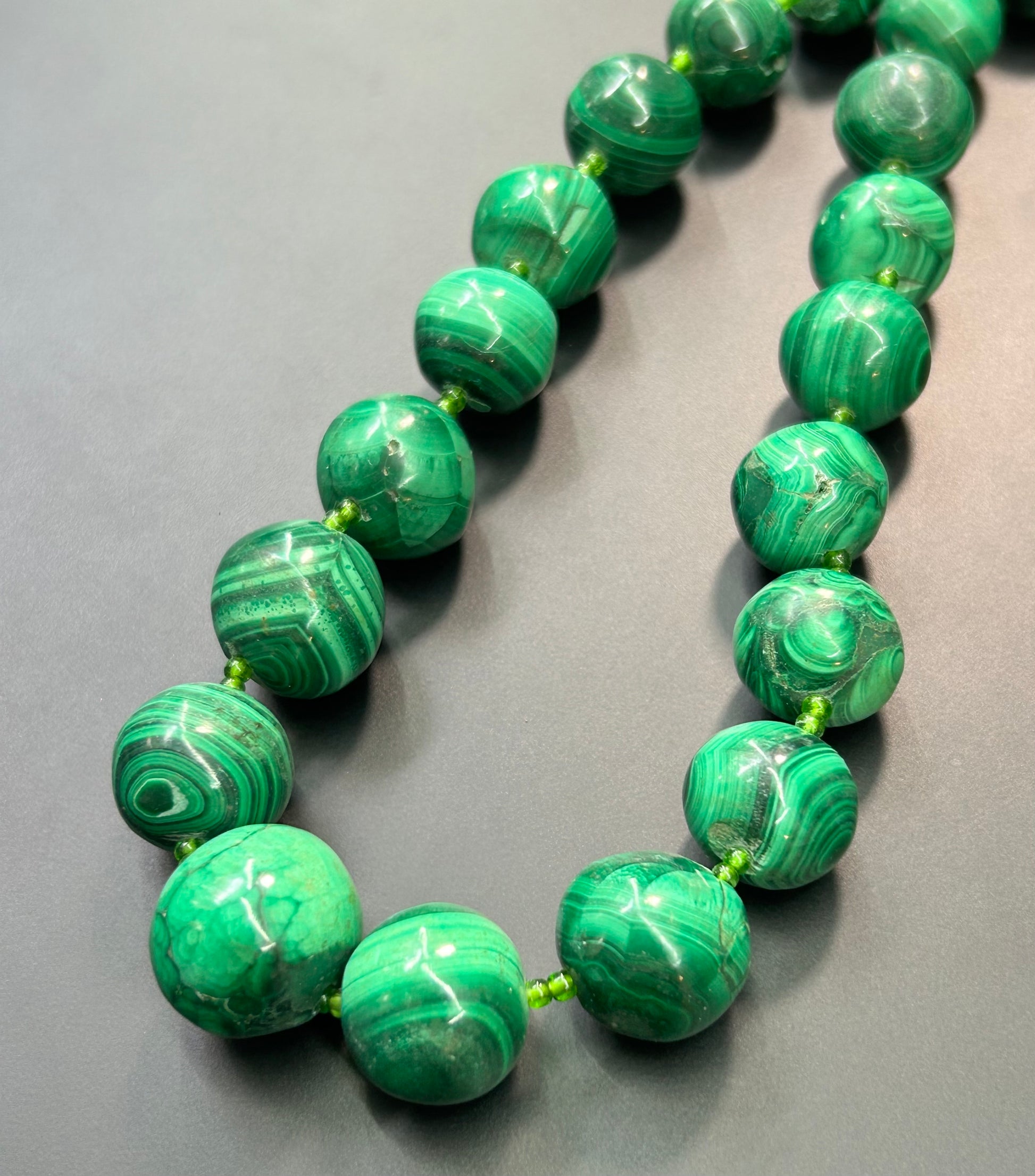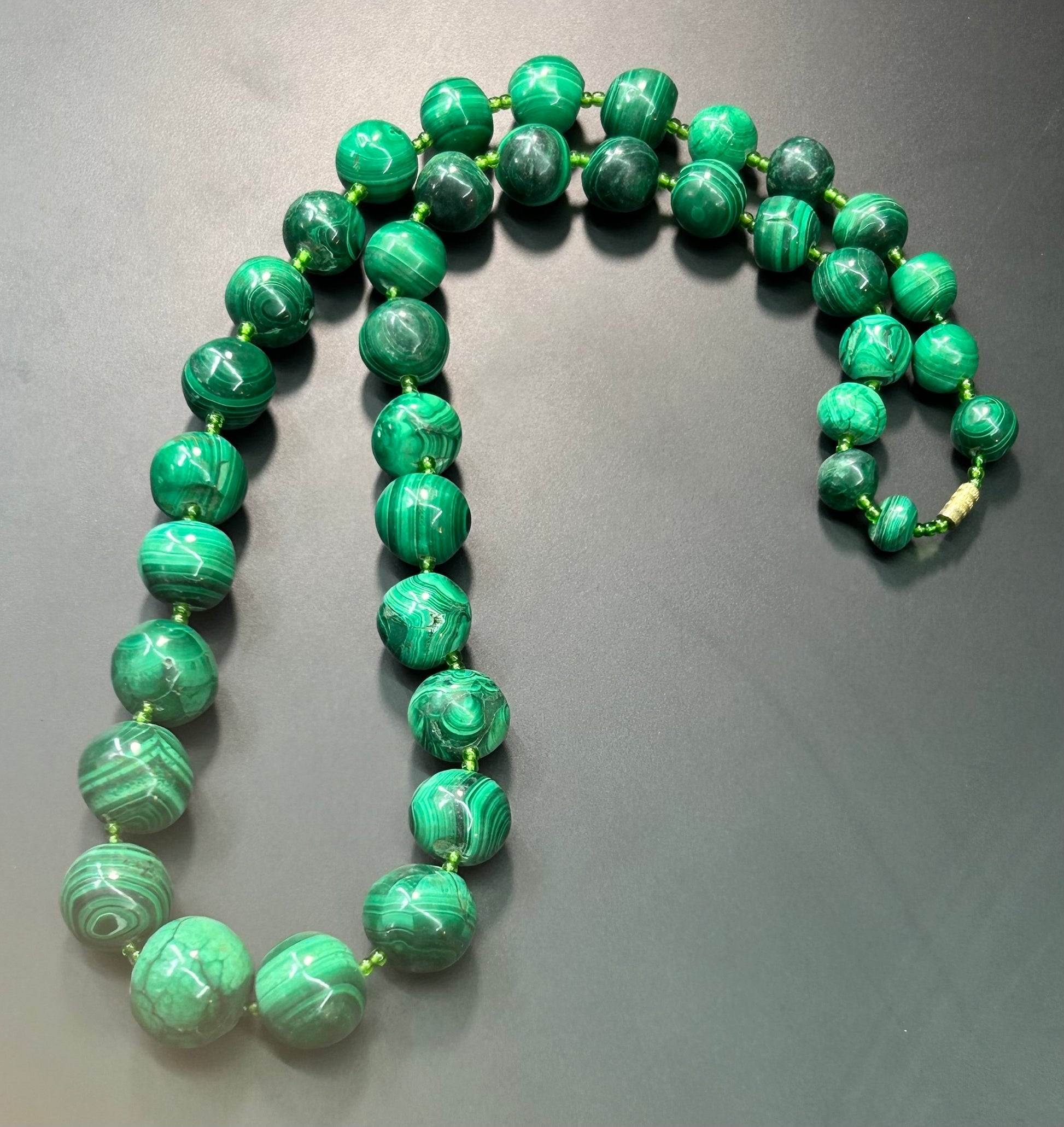 Large and chunky graduated malachite bead necklace with seed bead spacers and barrel closure