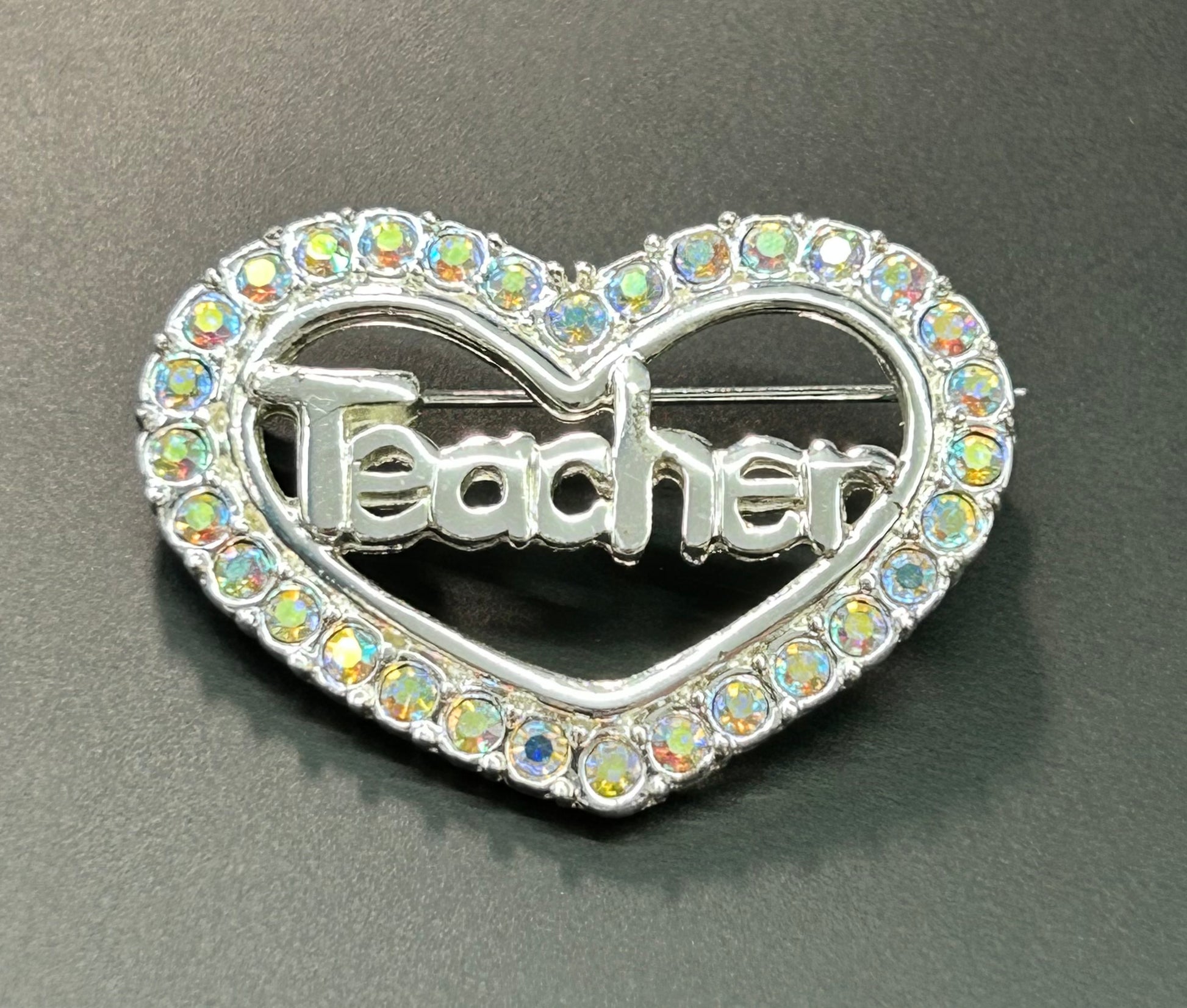Silver tone aurora borealis rhinestone heart teacher brooch