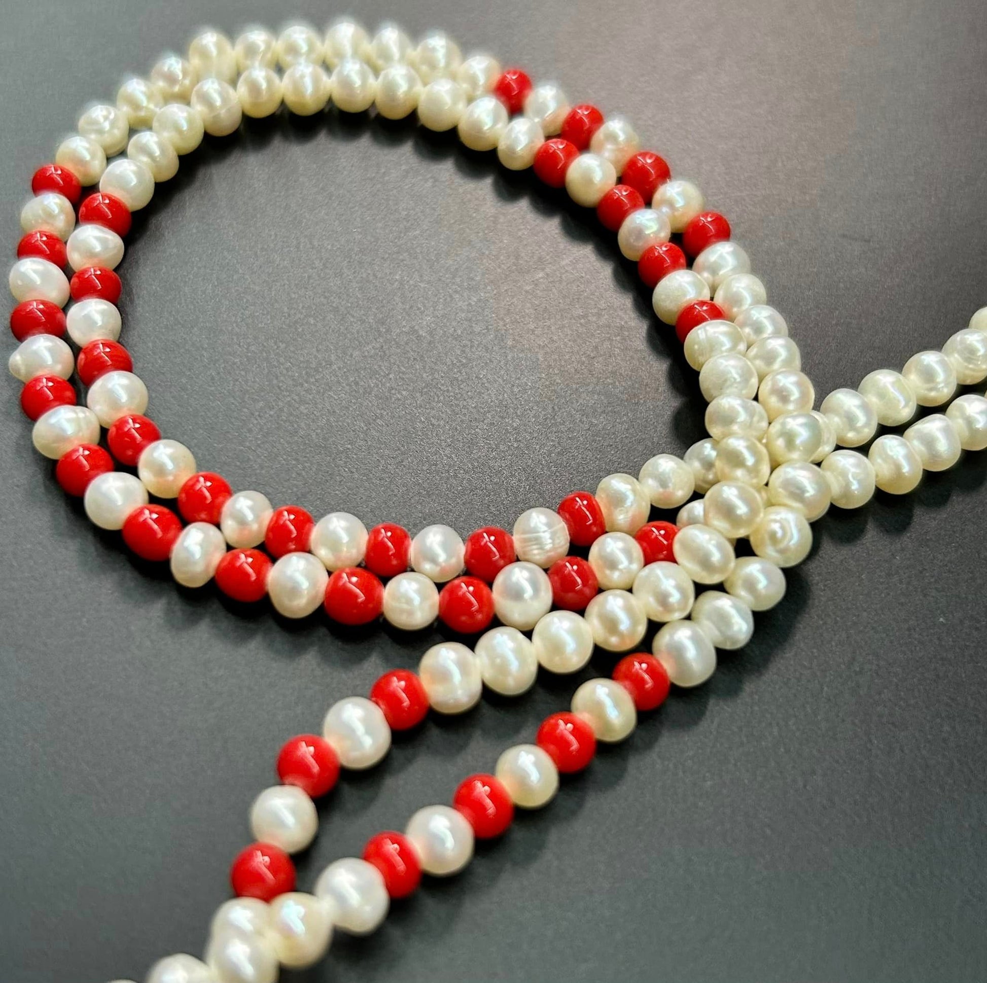Double strand pearl and red bead necklace