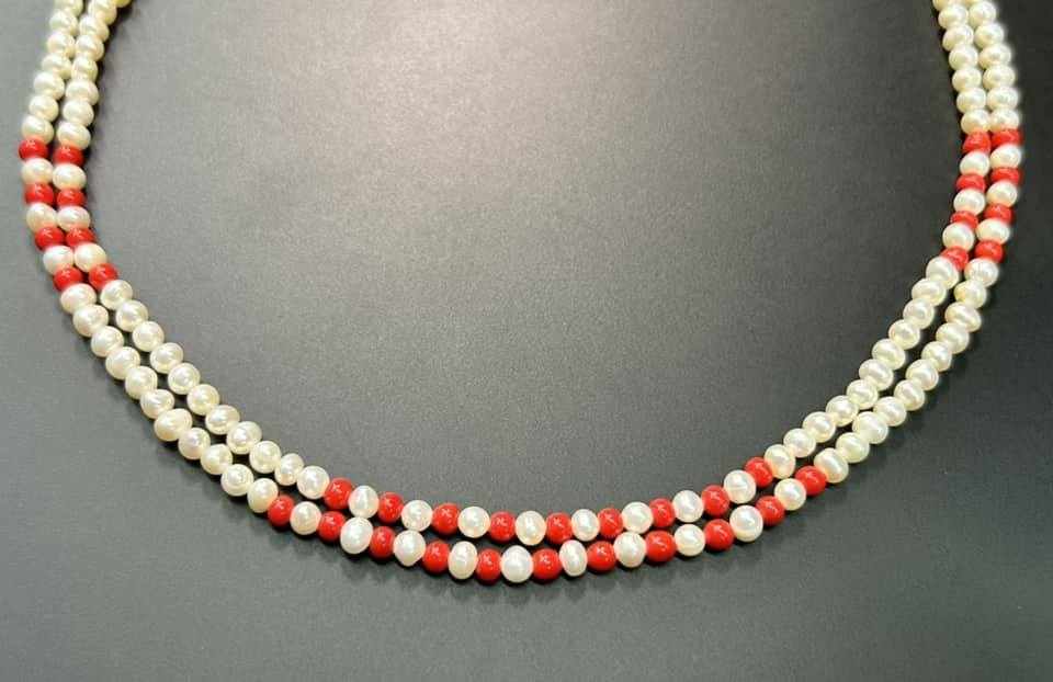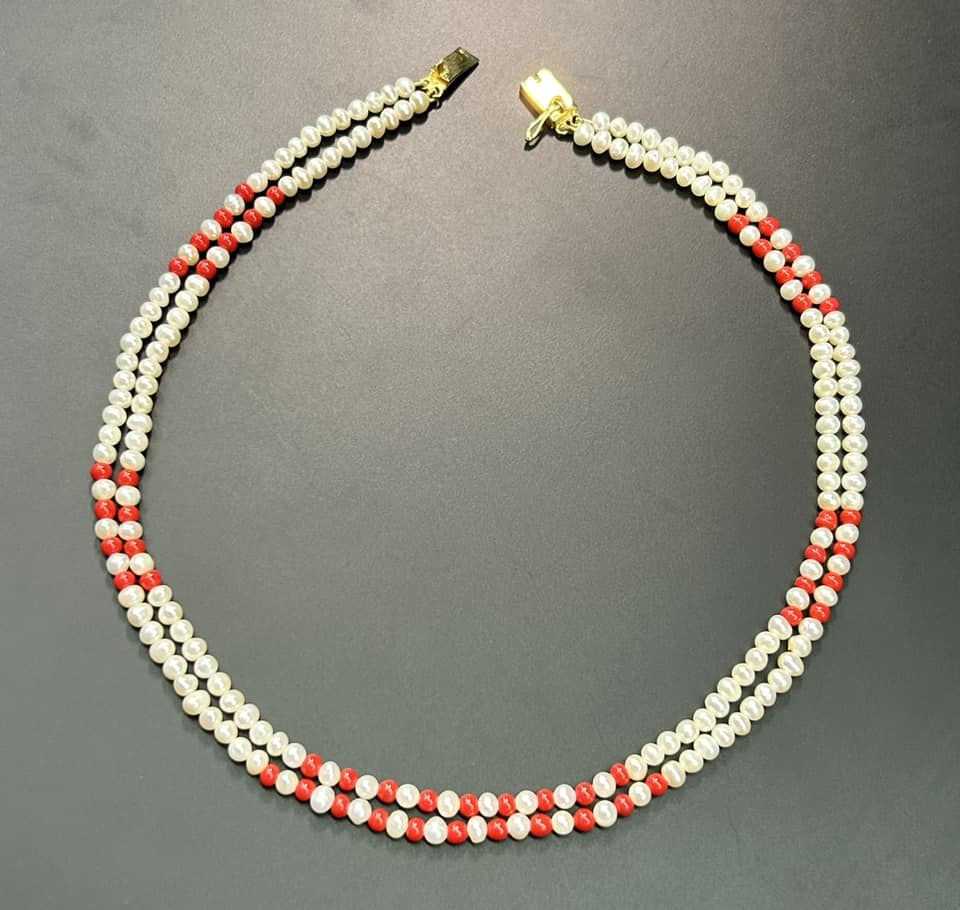 Double Strand Pearl & Red Bead Necklace