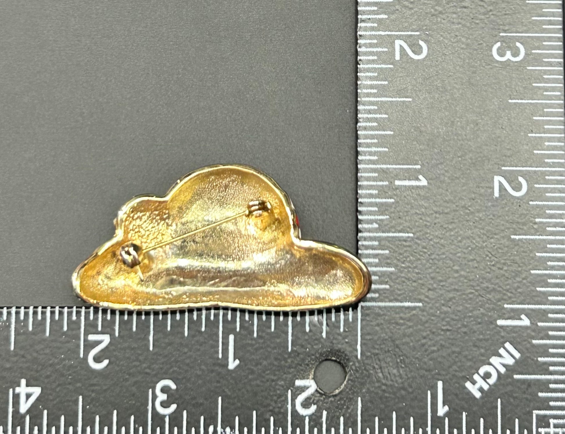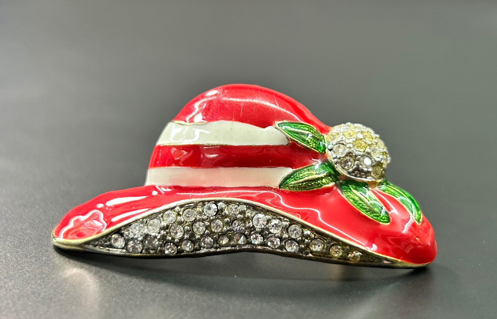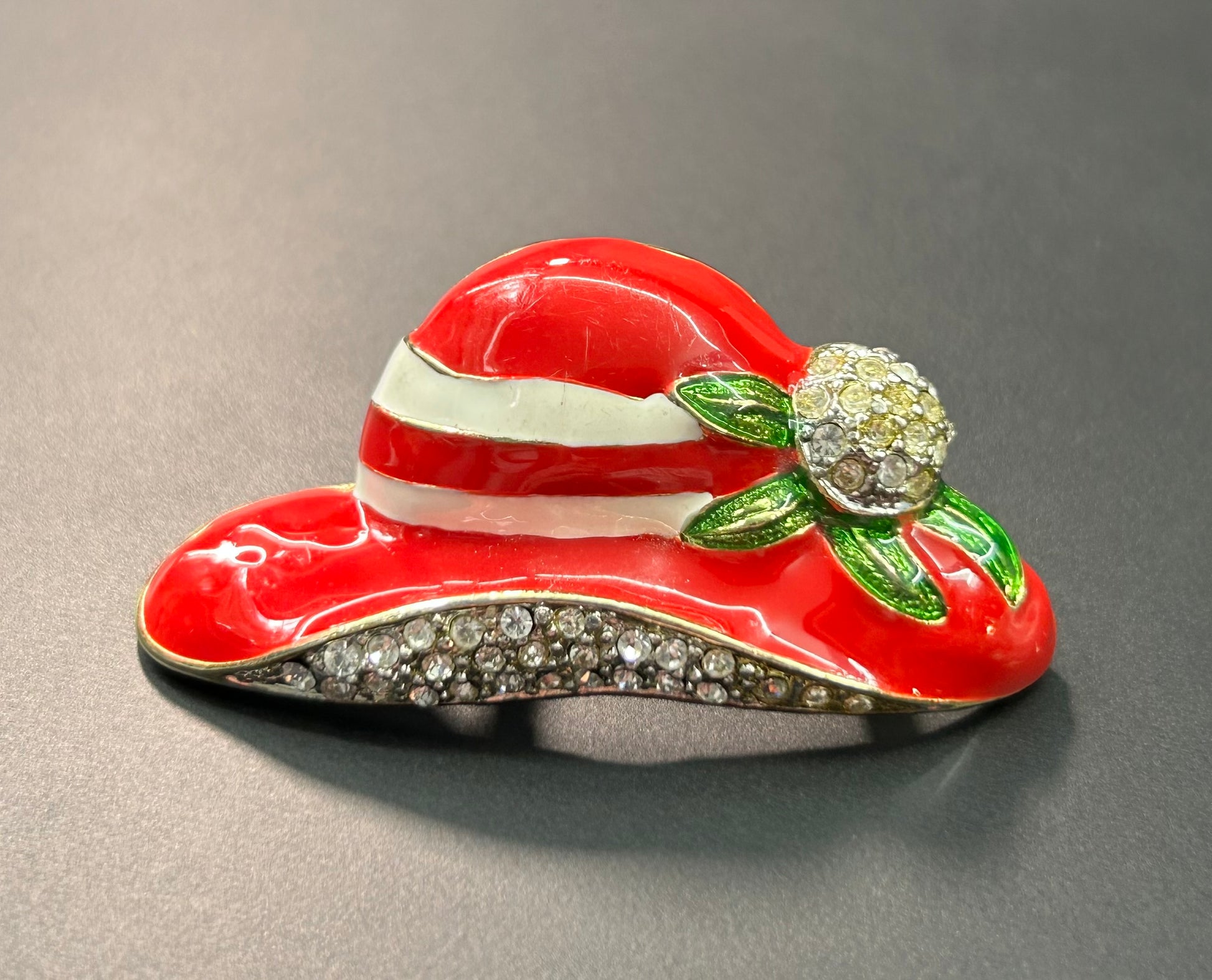 Gold tone enamel rhinestone red hat brooch