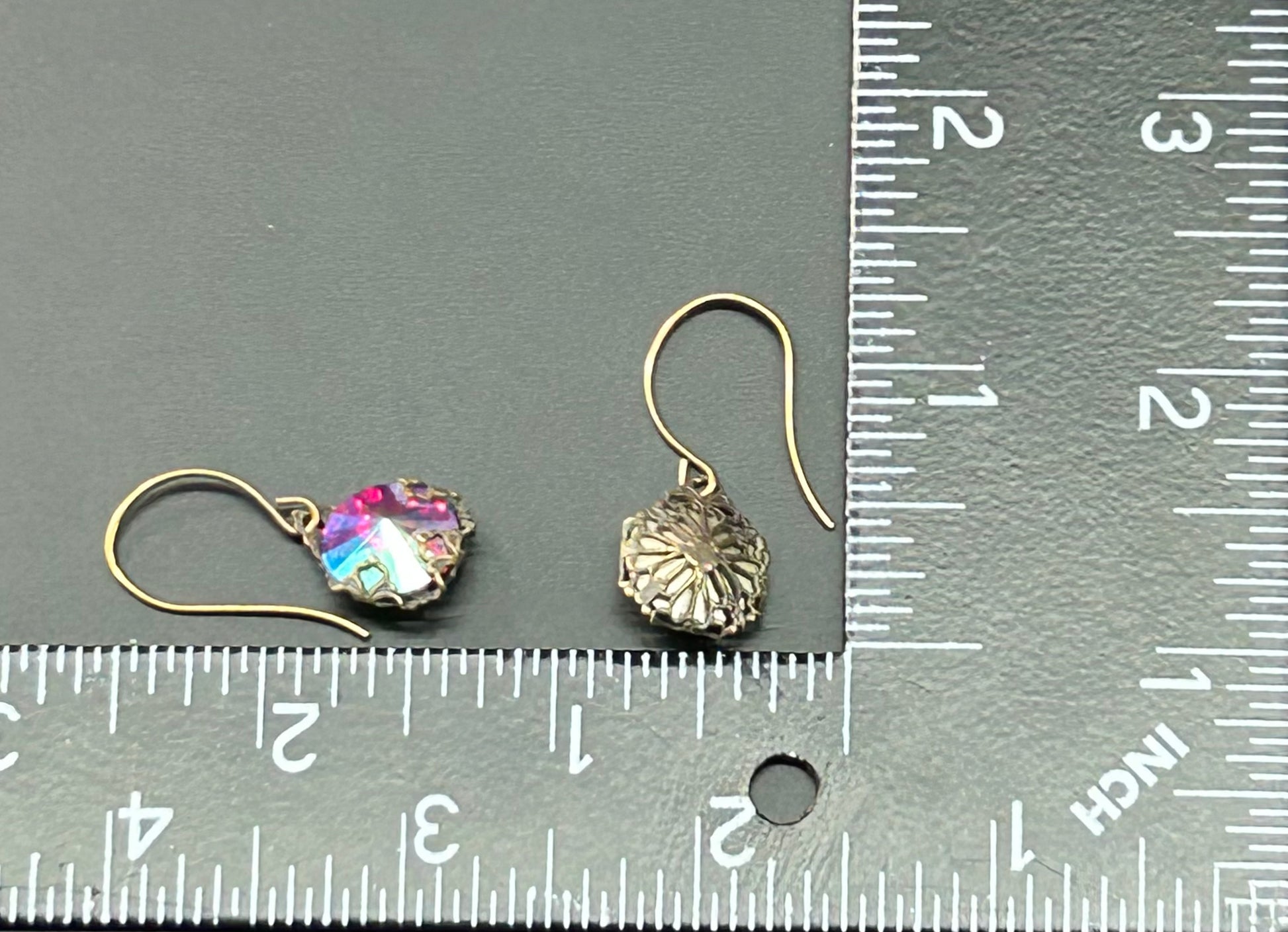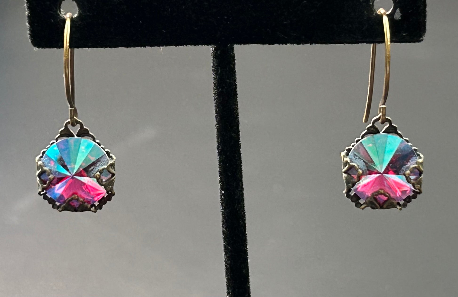 Brass tone rivoli aurora borealis rhinestone dangle earrings