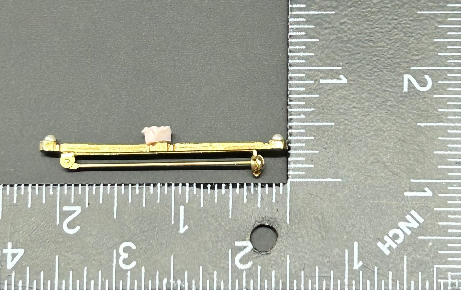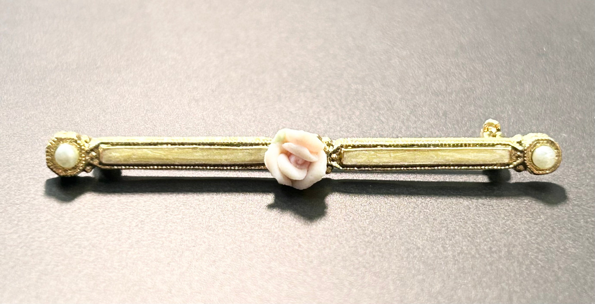 Gold tone and enamel porcelain pink rose and faux pearl bar brooch