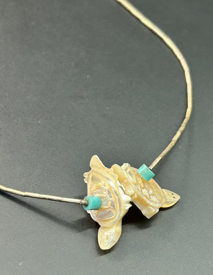 Sterling liquid silver mother of pearl turtle fetish and turquoise beads necklace with barrel closure