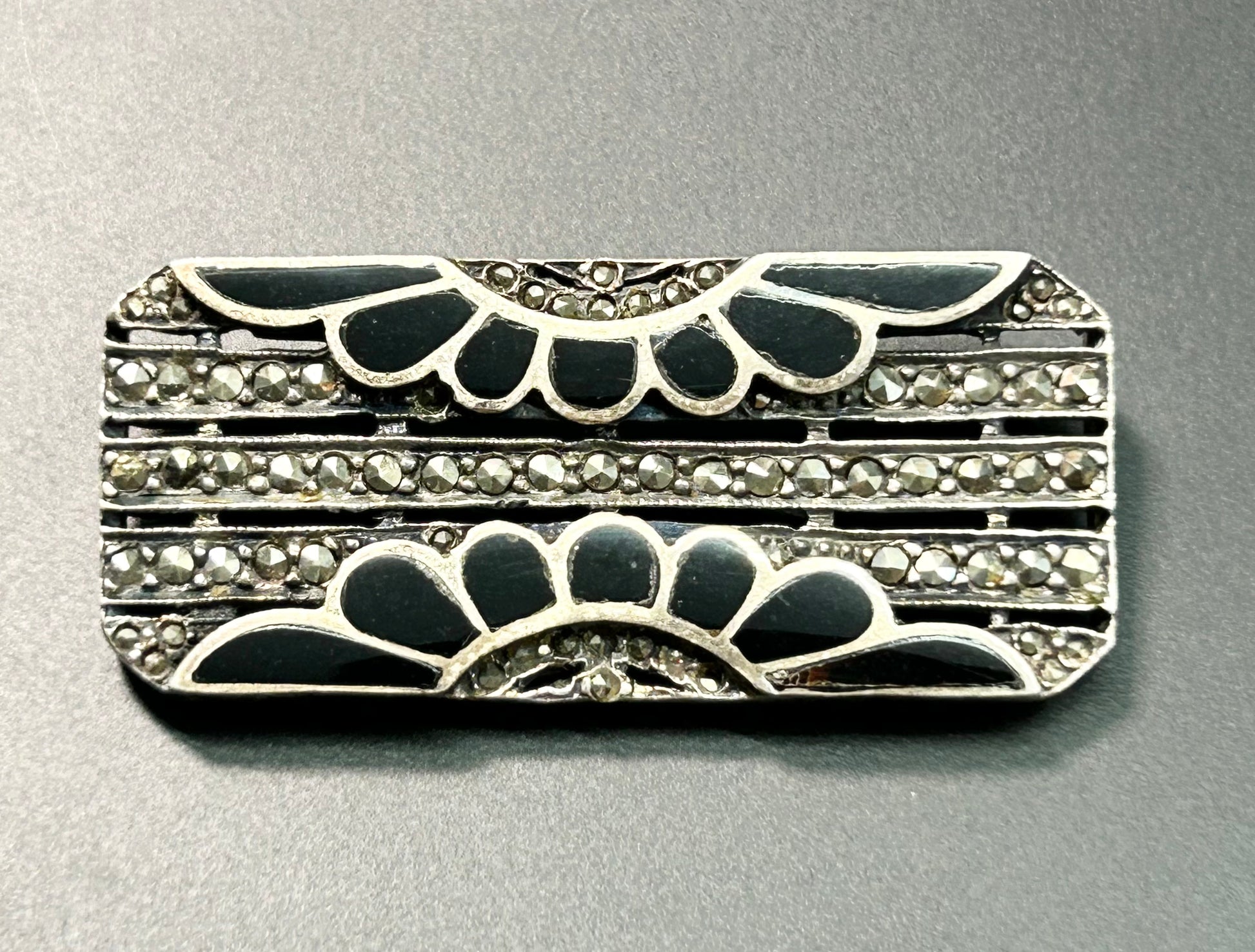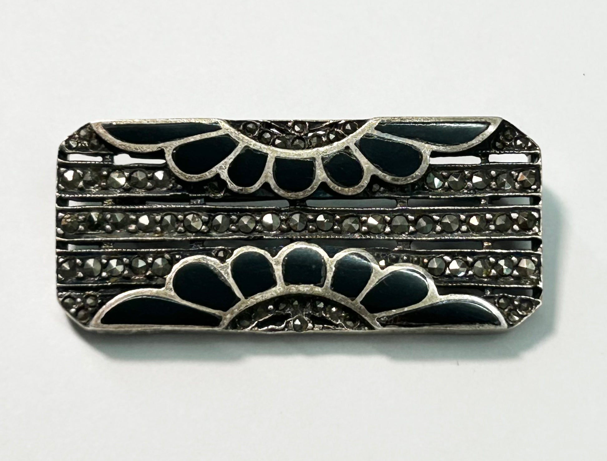 Sterling silver onyx and marcasite brooch