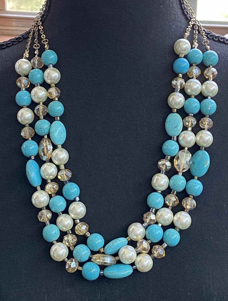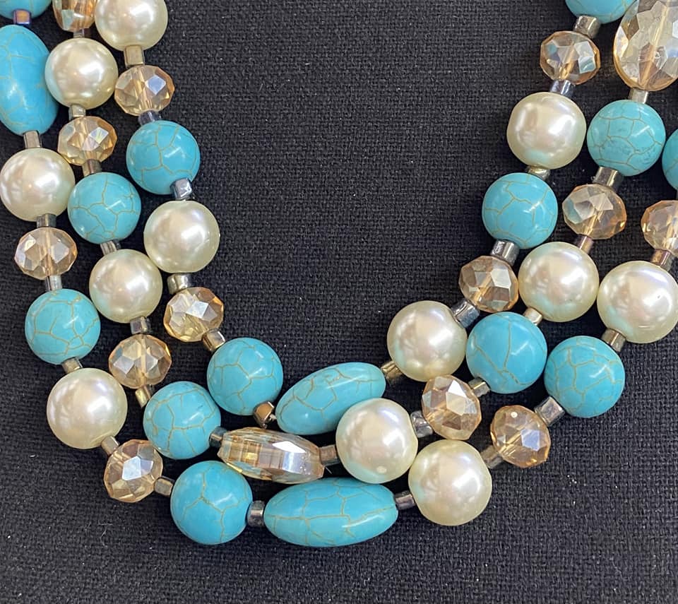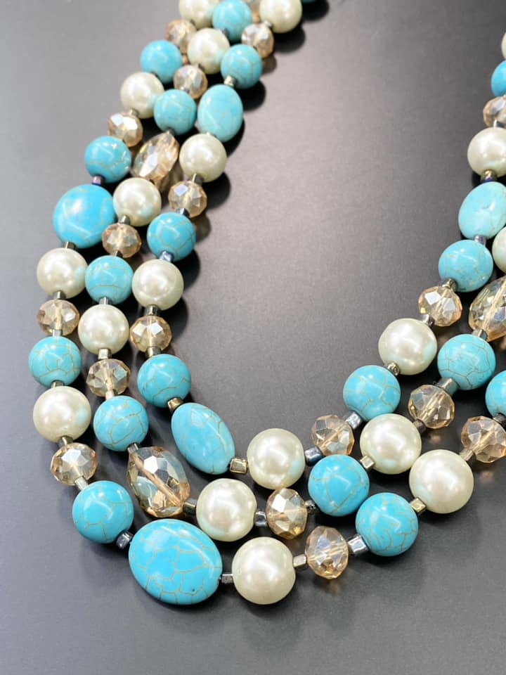 Triple strand dyed stone, faux pearl, and faceted glass bead necklace