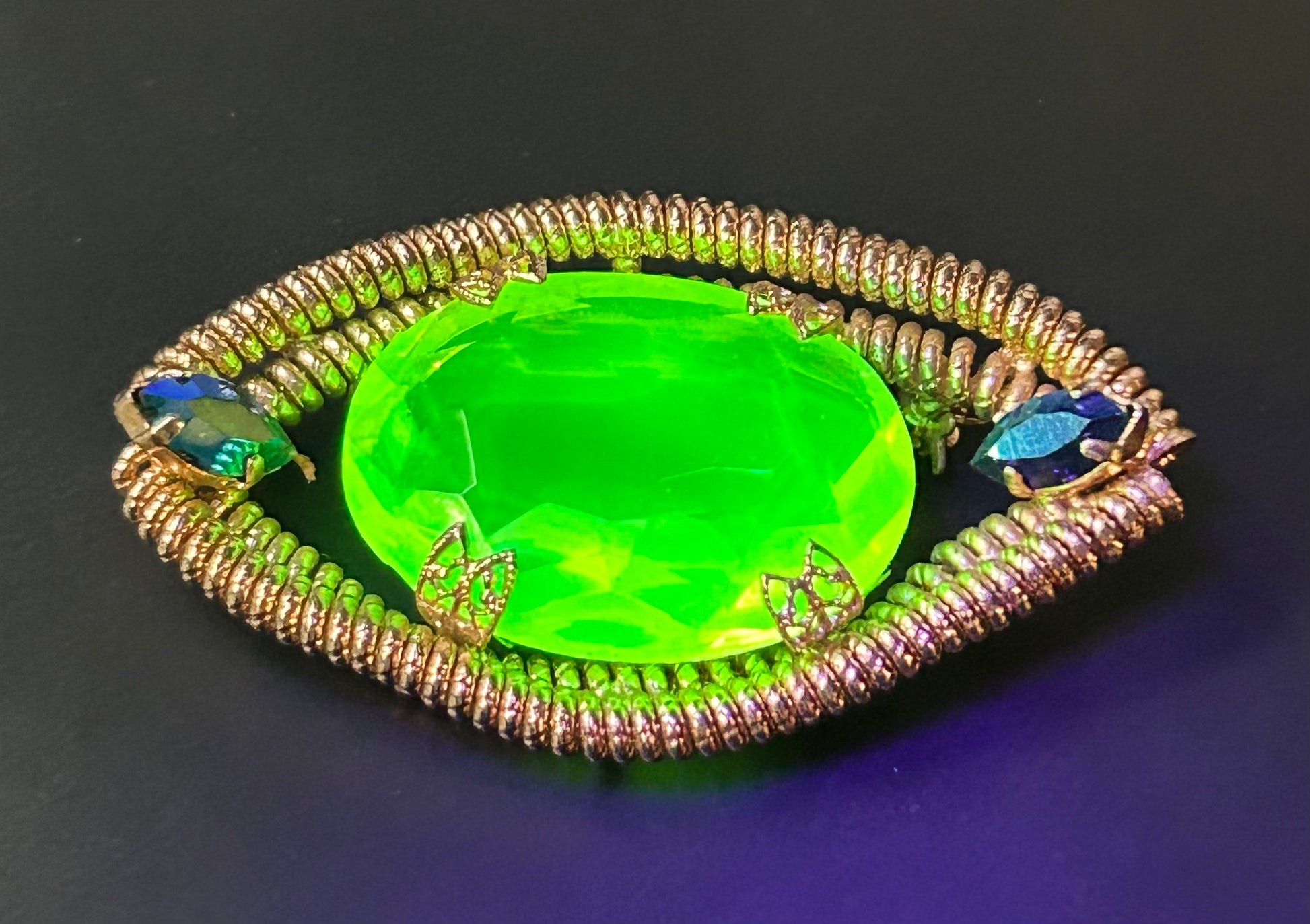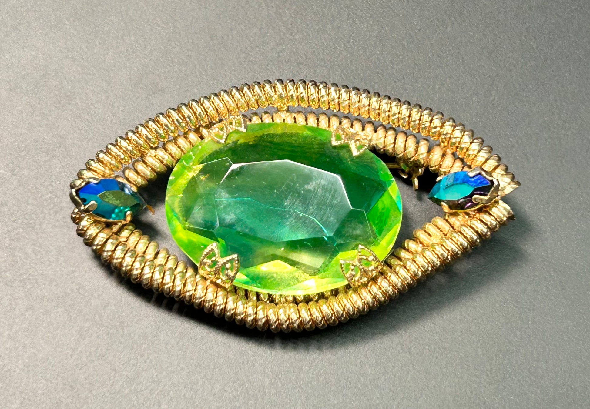 Vintage gold tone uranium glass and AB rhinestone brooch